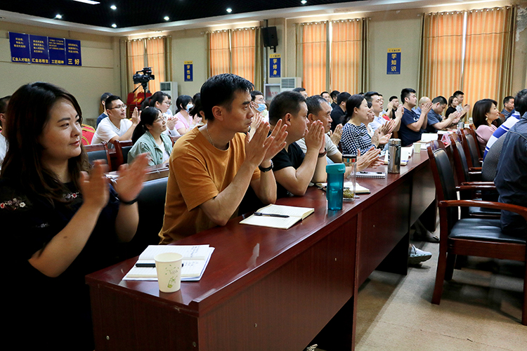 姜衛總經理通過回顧自己從上學、組建家庭到參加工作等不同階段的故事經歷,講述了“讓家庭過上幸福美滿生活”的承擔感悟。同時列舉自己與郭榮勛董事長的點滴故事,以郭董做事“考慮別人”、“有標準”、“計劃性強”的三大優點總結,向我們展示出了郭董優秀的承擔精神和高尚的人格魅力。隨后,姜總通過闡述自己和銷售人員良好處理銷售難題的正向案例和采購中遇到的“不承擔”反向案例,向大家解讀了關于承擔“說大家想聽、做大家所想”的分量以及“承擔是道”的意義。