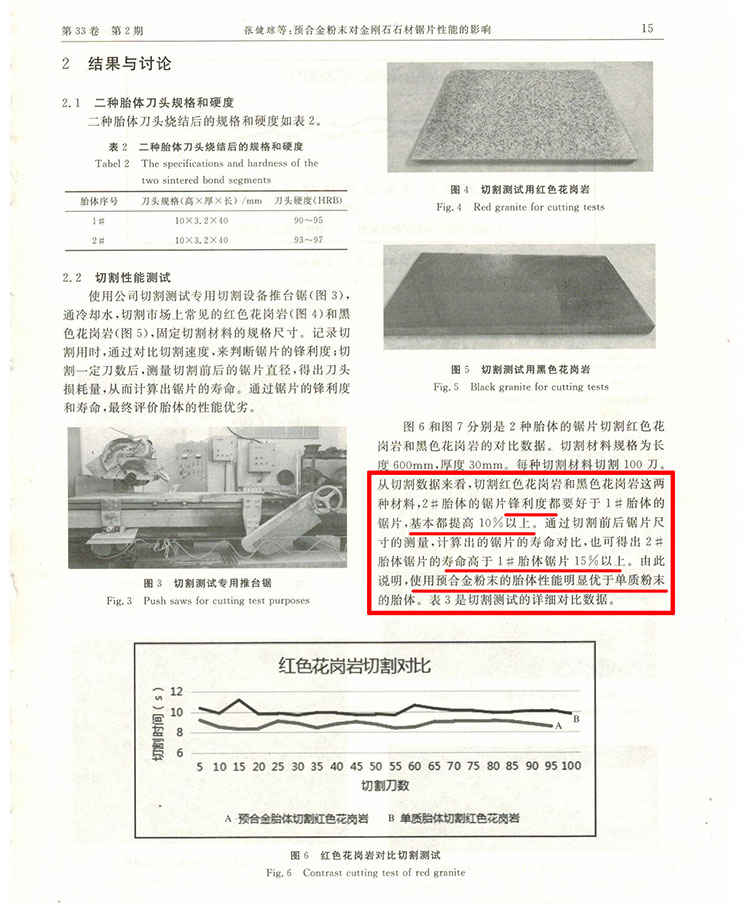 2021年4月10日,張健瓊、楊志威、劉一波等專家學者在超硬材料行業聞名期刊《超硬材料工程》第33卷第2期發表了《預合金粉末對金剛石石材鋸片性能的影響》一文。
