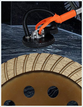 金剛石磨具, 是由金剛石刀頭焊接或者冷壓在金屬基體上而成;金剛石刀頭是通過人造工業金剛石和金屬結合劑,冷壓和熱壓燒結而成。金剛石磨輪通常被裝在混凝土打磨機上來打磨如混凝土,花崗巖,大理石和其它的一些石材等。